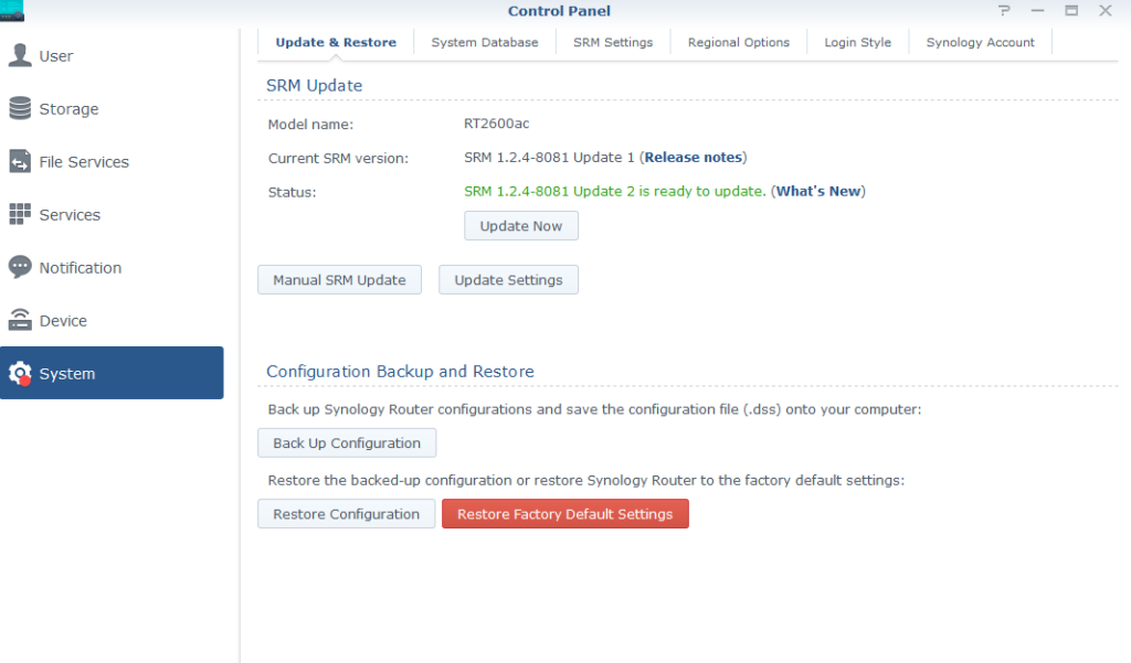 Synology 群暉科技 RT2600ac 路由器今日收到 SRM 1.2.4-8081 Update 2 更新, 更新時會造成網路中斷 10 分鐘, 對於 24×7 的環境, 需慎選更新方式與時段.