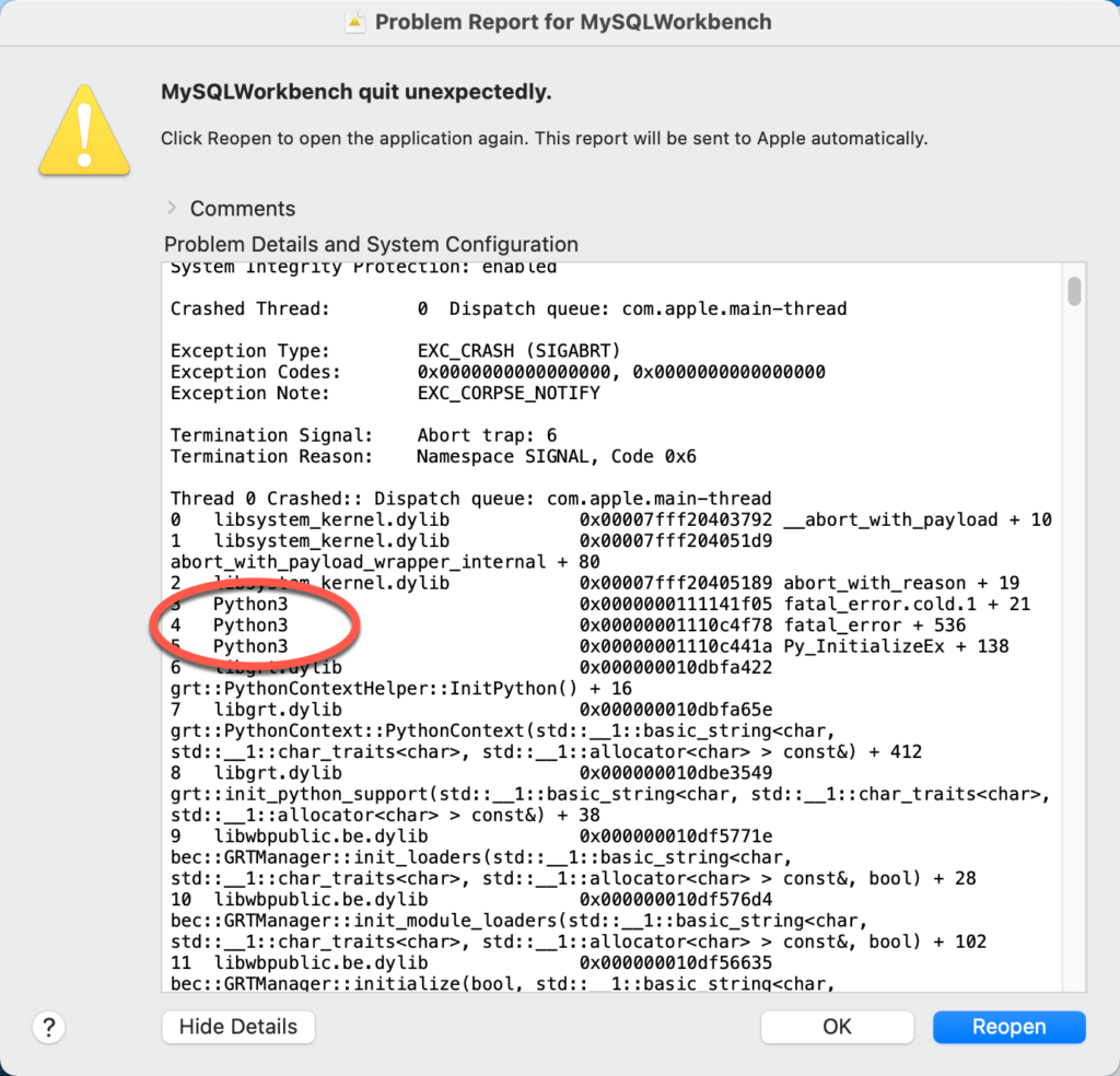 由於平常大都使用 Microsoft Windows 10 上的 MySQL Workbench 存取 MySQL 資料庫, 前陣子將它升級到最新的 8.0.23 時也沒碰到什麼問題, 因此認為 macOS 的朋友應該也可以直升至 8.0.23. 沒想到今天在運行 macOS Big Sur 11.2.3 的 MacBook Pro (Intel) 使用它, 才知道它對 macOS Big Sur 過敏, 根本無法啟動, 出現如下面的錯誤畫面, 還好降級到 8.0.22 就又恢復正常運作, 只能看官方什麼時候修好了.