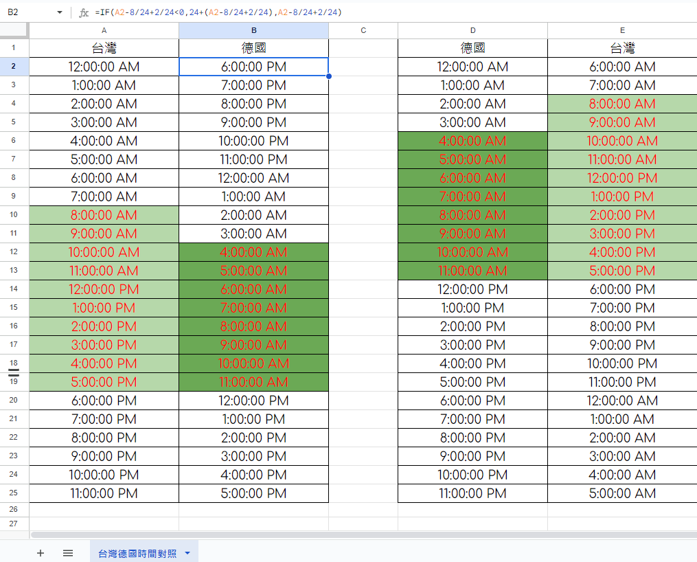 2023-08-232023-08-23資訊科技 Excel 中,要怎麼製作時區的逐小時對照時間表呢? 不管是為了旅遊還是工作的需要,除了將手錶或手機的時區調整成雙時區對照顯示之外,有時我們也會需要一張對照表,方便溝通或查閱計畫所需,這裡介紹一個簡單的方式可以很快地在 Excel 中,建立逐小時的時間對照表。 以德國、台灣 […]